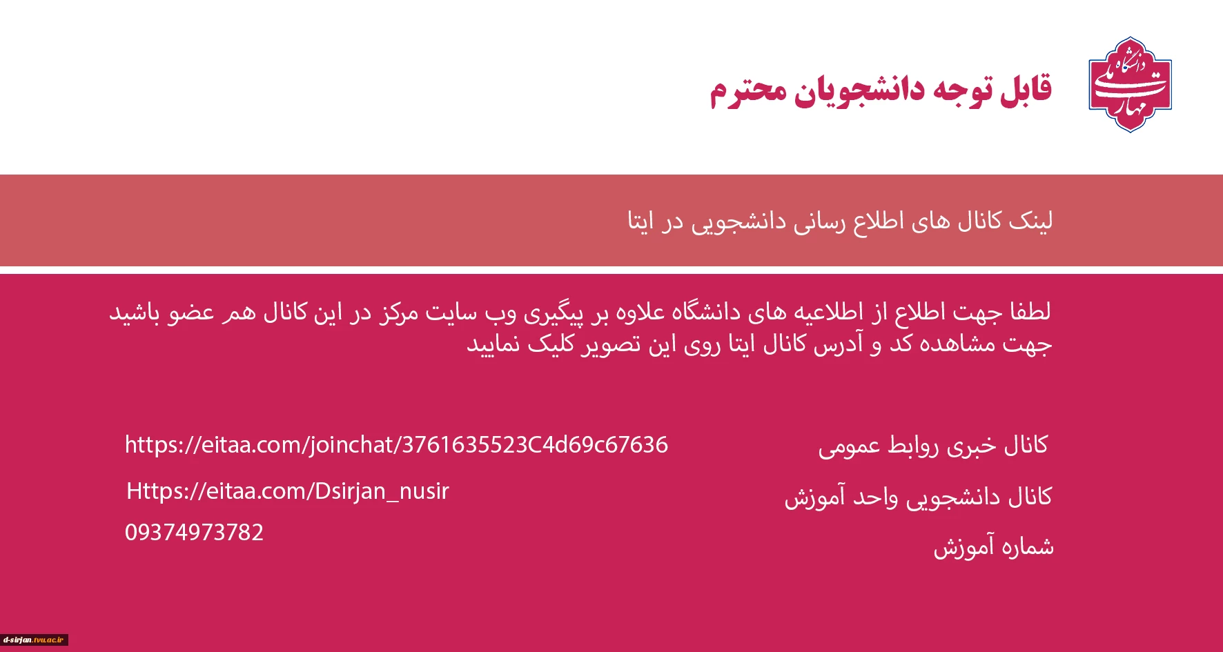امتیاز دهید : لینک گروه های دانشجویی دانشگاه ملی مهارت مرکز دختران (سیرجان) 3 شنبه 12 مهر 1404 ساعت 10:38